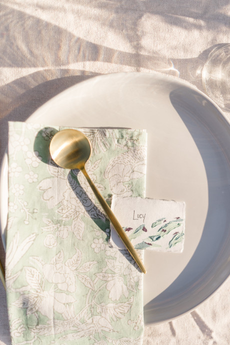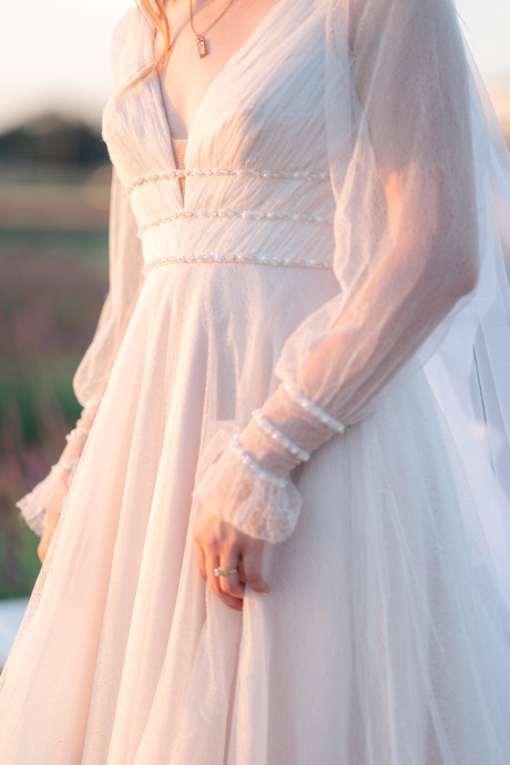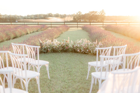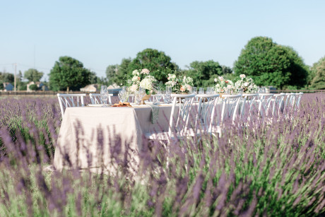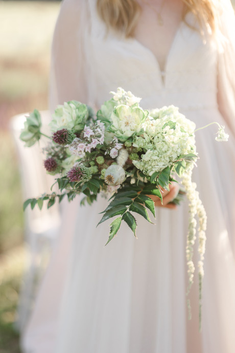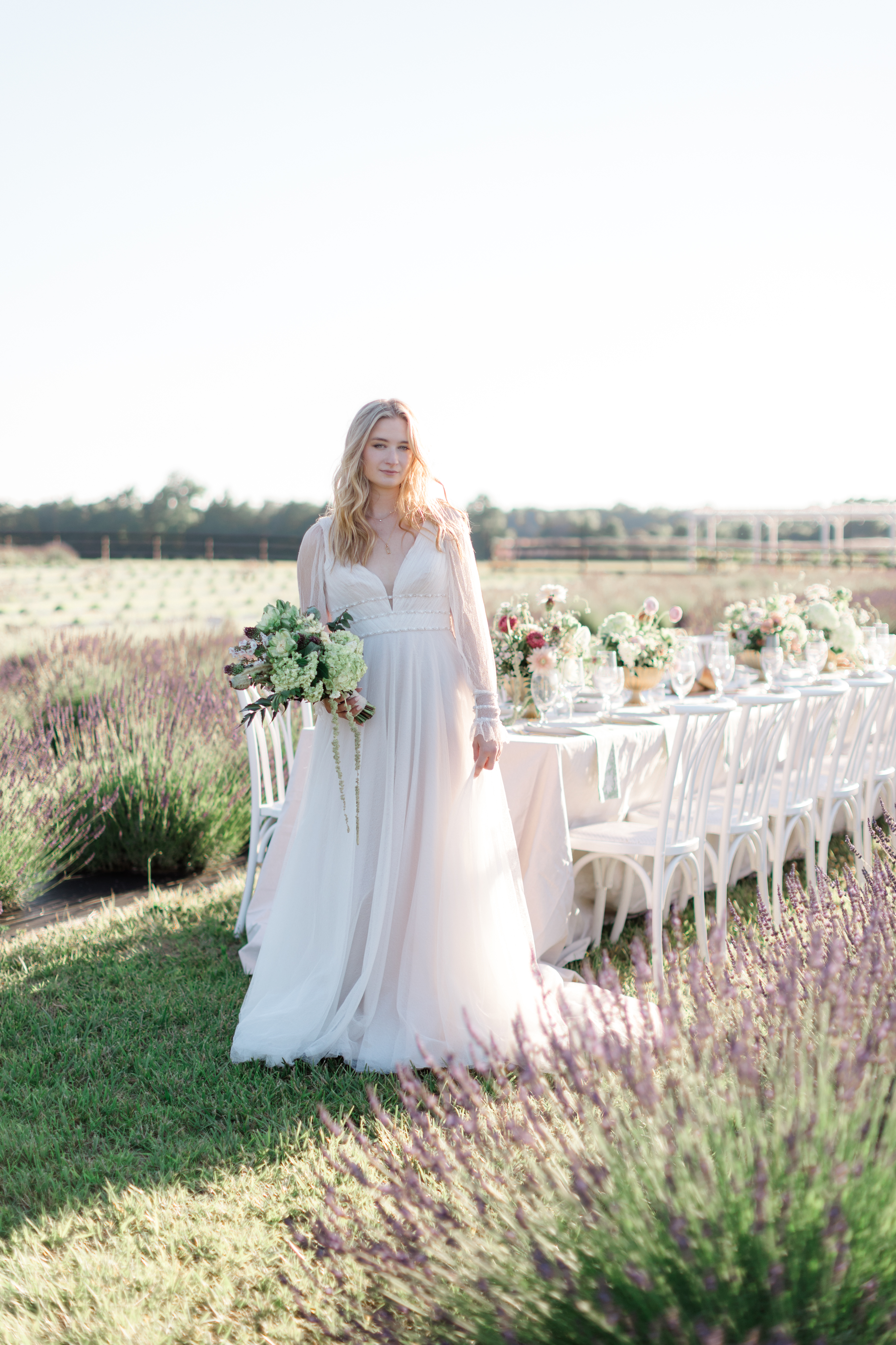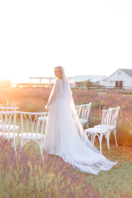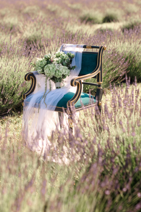“Grace, green, and gardens were the inspiration for this elegant but natural themed bridal shoot at Brittingham Farms, a lavender wedding venue tucked just beyond the Delaware shoreline. Garden greens graced the table settings, and a flowy bridal gown complemented the surrounding farmland, while the bright lavender fields and the setting sun served as an elegant, but organic backdrop.” – Mo Garratt