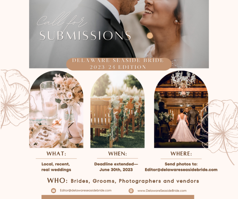 Don't forget—we want to see your best! We want to see weddings big and small—full of personality, color, and style! The more unique, the better. Show us the standout glitz and glam of your daytime celebrations or evening soirées! Don't miss this chance to be featured in Delaware Seaside Bride Magazine. Send full wedding gallery links to Editor@DelawareSeasideBride.com
