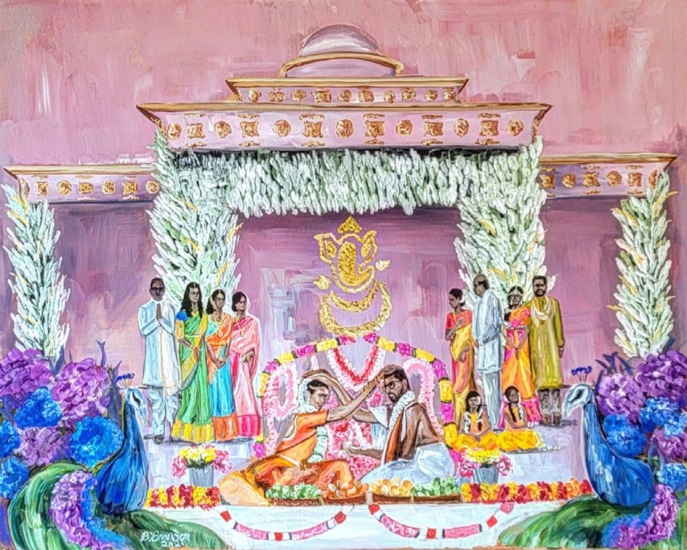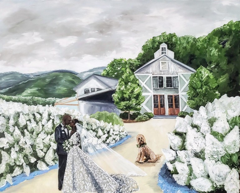 While each of these souvenirs are as pragmatic as they are poignant, there’s another service in which couples can commission a keepsake that fully captures the emotional core of the day, by preserving a meaningful moment in a newlywed’s journey with nothing but paint and a blank canvas full of possibilities.