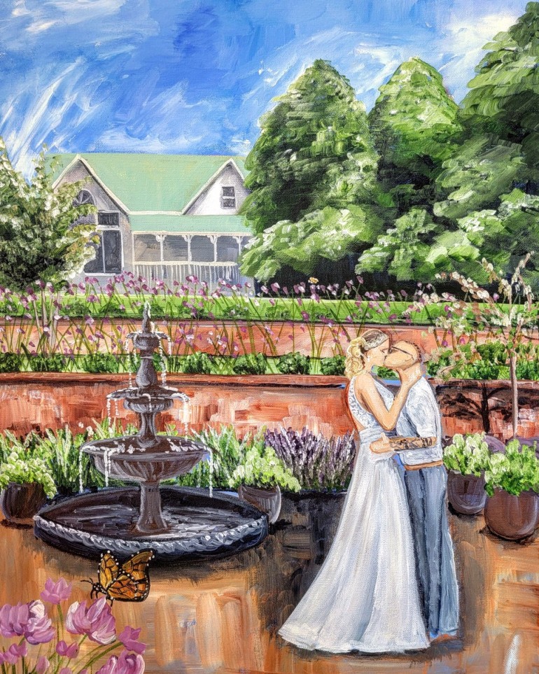 While the former designates her style to be post-impressionistic, and the latter as colorful and whimsical, each live painter has their own preferred medium and unique artistic perspective, which makes researching an artist’s work ahead of time an important first step for couples.