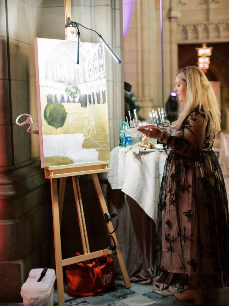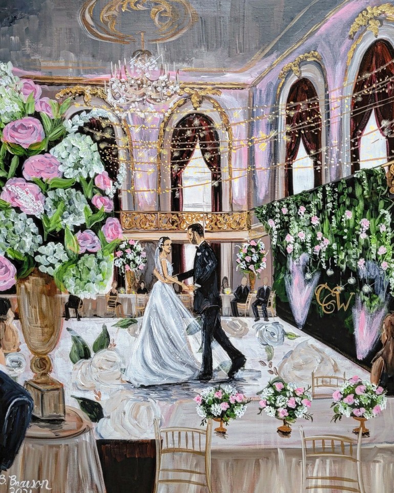 “Many of my couples love their venue’s ceremony space but ultimately want their first dance painted. And so I’ll often paint them in a first-dance pose, but within the ceremony space,” said Brittany. “That way, both elements that they love are cohesively captured together.”
