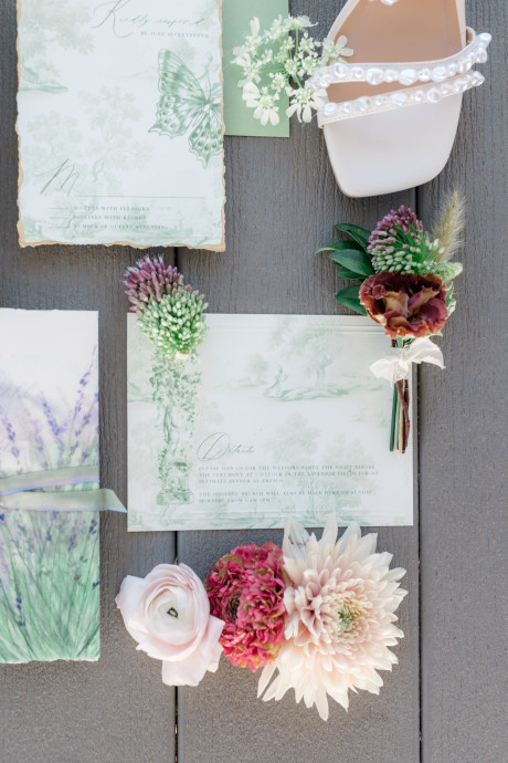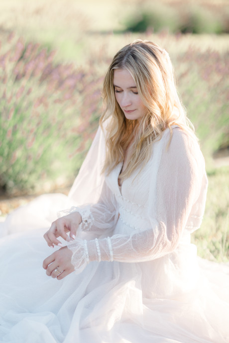 “Grace, green, and gardens were the inspiration for this elegant but natural themed bridal shoot at Brittingham Farms, a lavender wedding venue tucked just beyond the Delaware shoreline. Garden greens graced the table settings, and a flowy bridal gown complemented the surrounding farmland, while the bright lavender fields and the setting sun served as an elegant, but organic backdrop.” – Mo Garratt